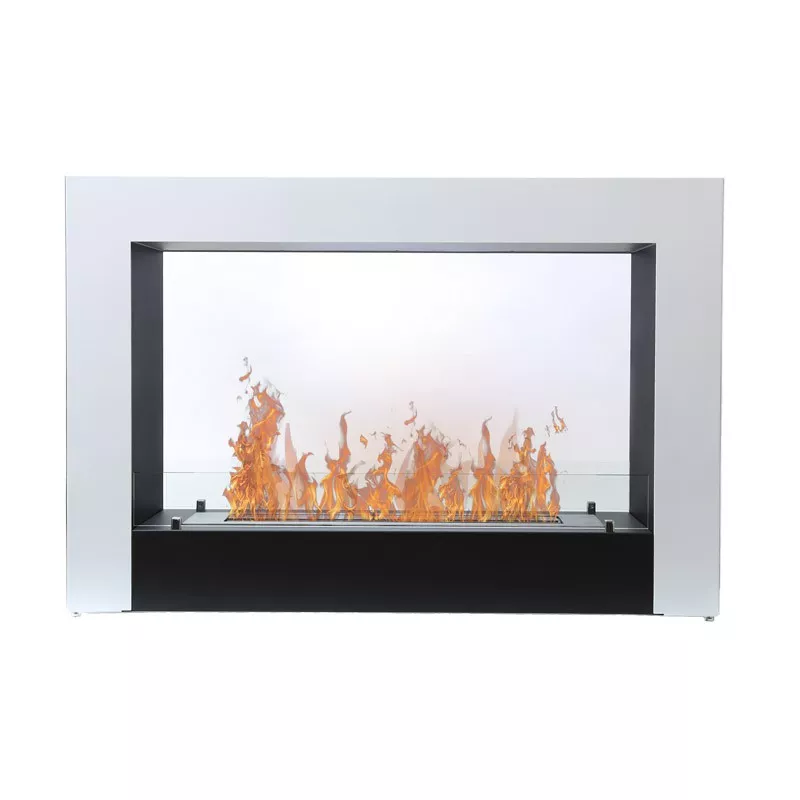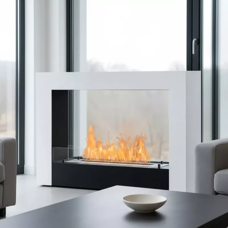Acarenza är utrustad med en 5 liters dubbelväggig brännare med ca 6 500 W effekt, vilket skapar ett stabilt och dekorativt flamspel samtidigt som den sprider behaglig värme i rummet. Tack vare att den använder bioetanol som bränsle blir forbränningen helt rökfri och producerar minimal sot, vilket gör den till ett perfekt val för hem där man vill ha äkta eldskänsla — utan röklukt, sot och aska.