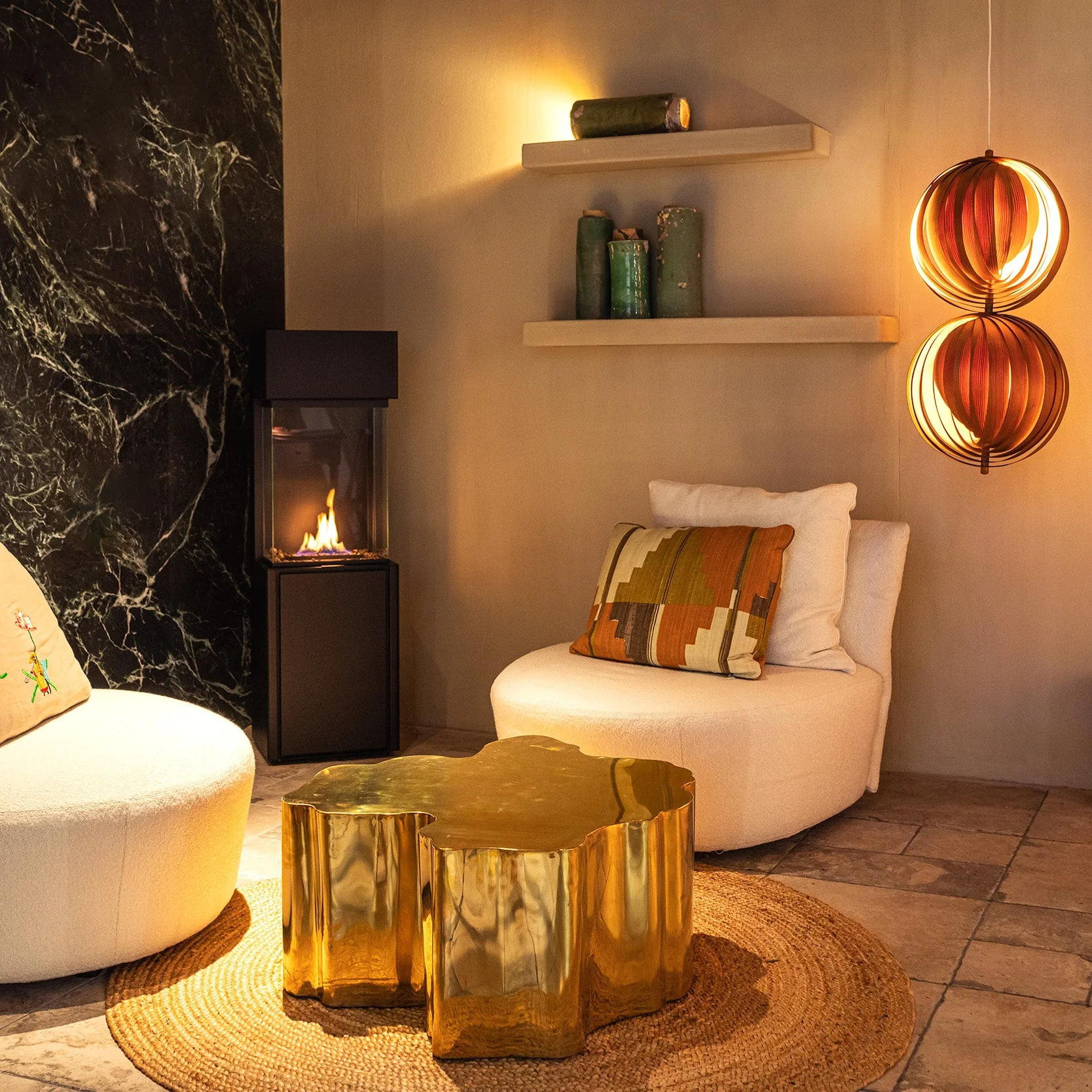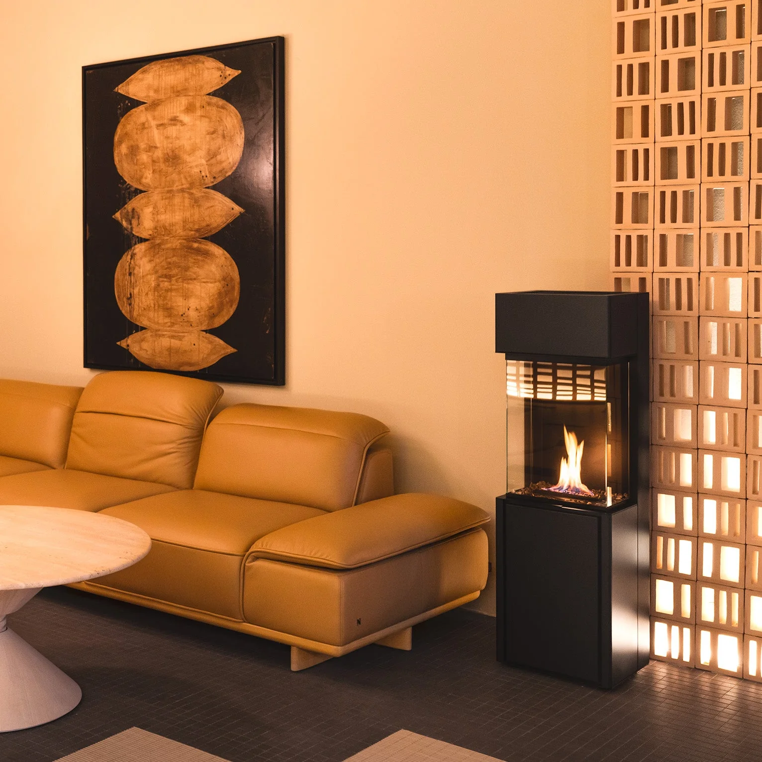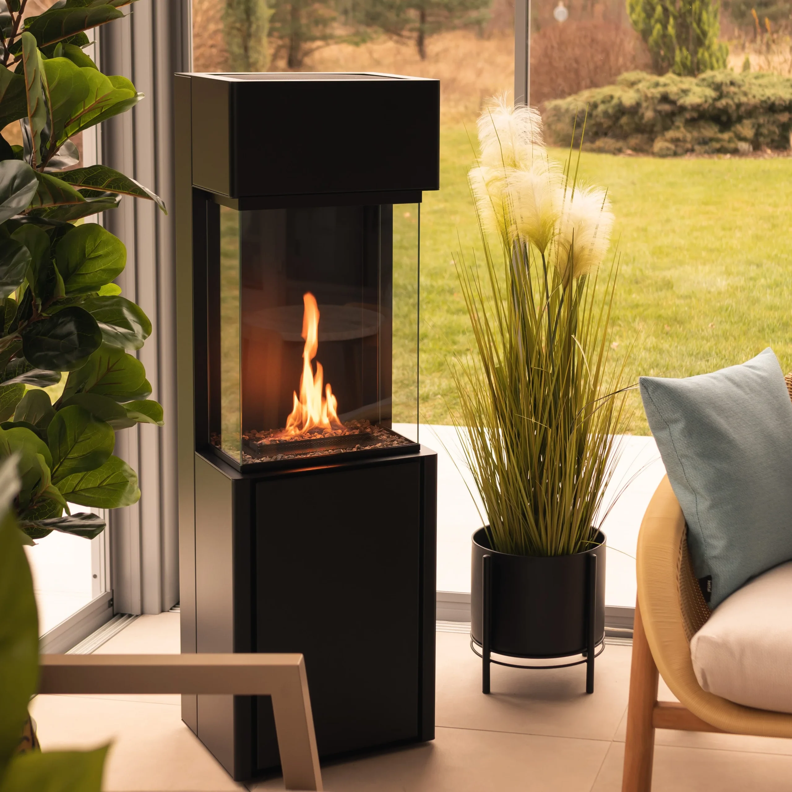 Den tredimensionella designen gör eldstaden till ett naturligt blickfång i rummet samtidigt som den passar perfekt i moderna, industriella eller skandinaviska interiörer. De skyddande glasen stabiliserar dessutom lågan och ger extra säkerhet samtidigt som flamman förblir tydligt synlig.