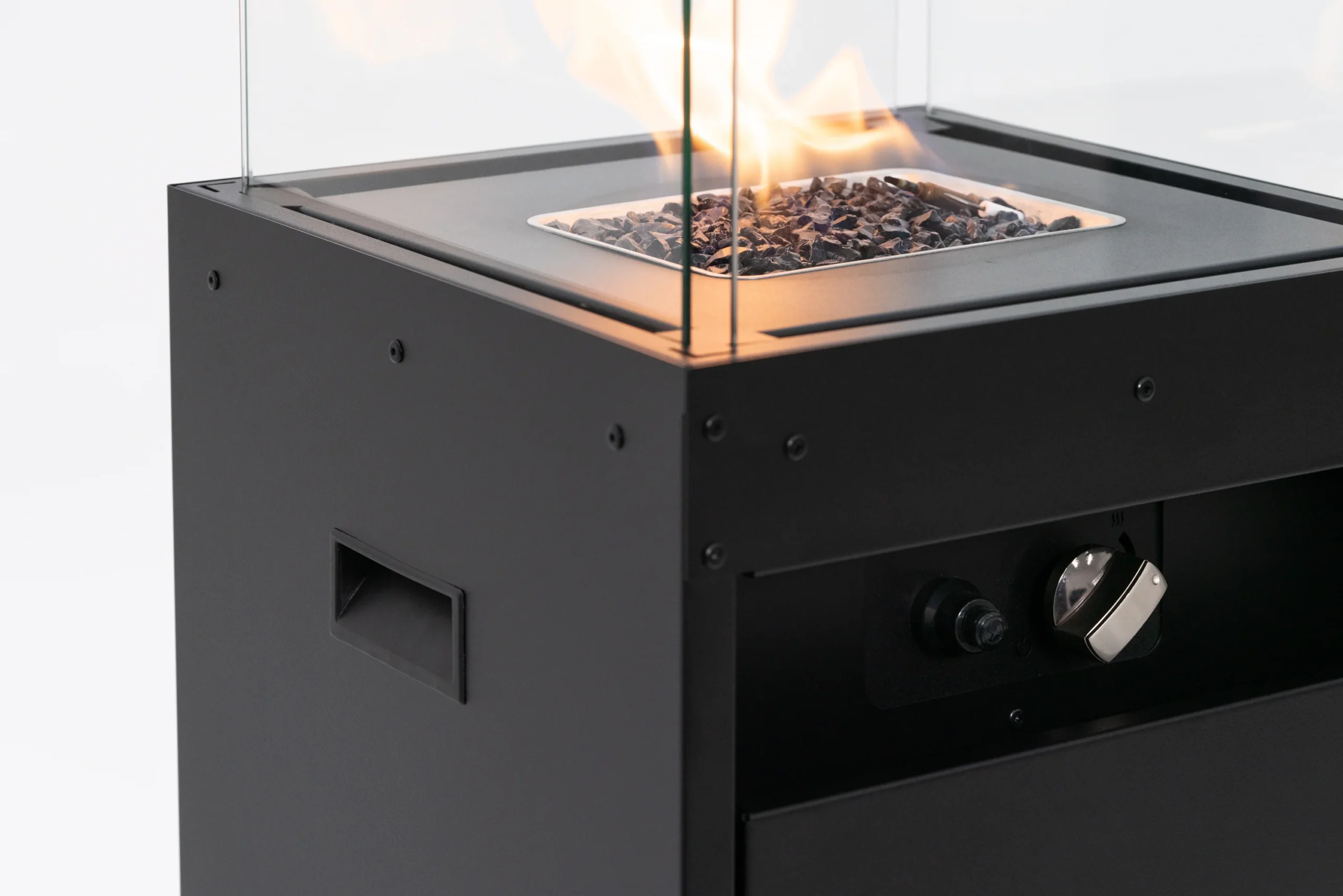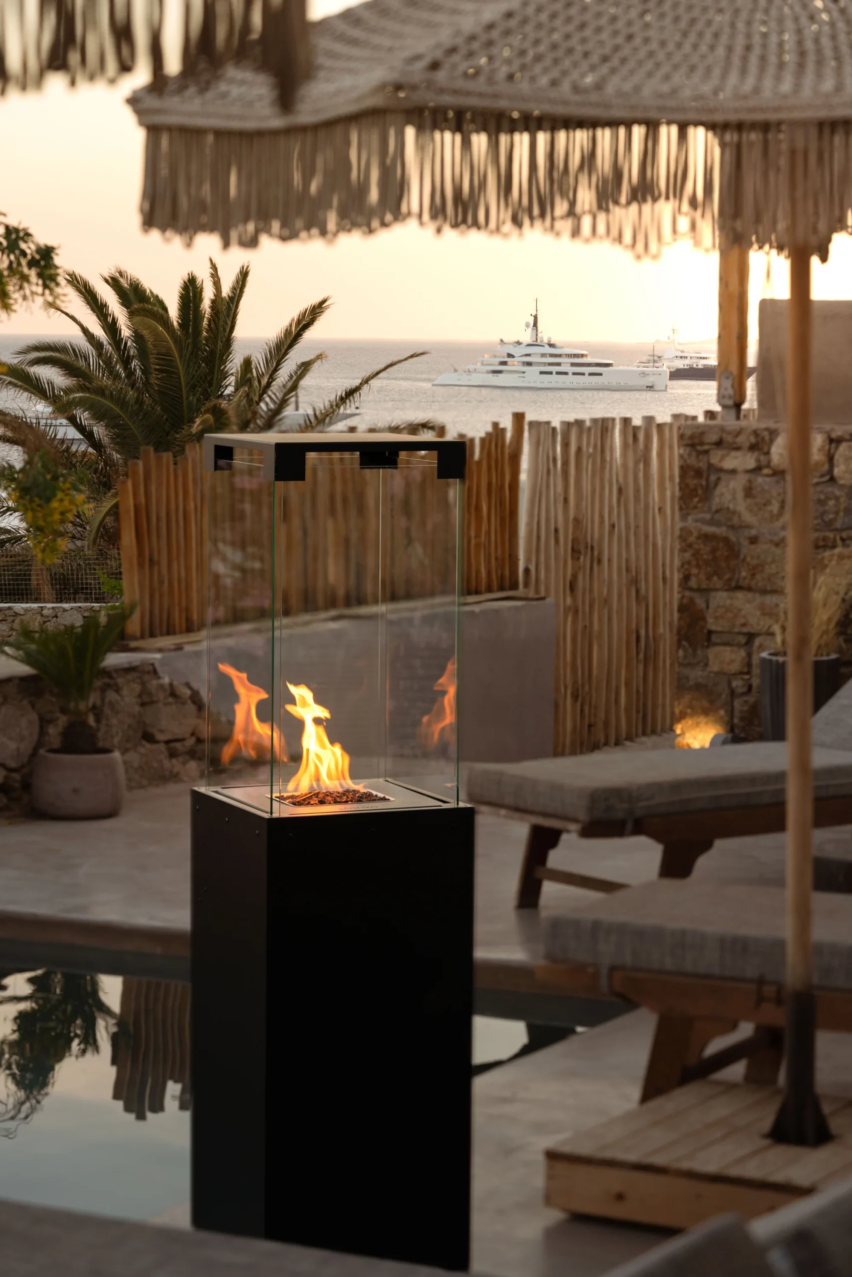 Faro Jet Black är en modern och elegant fristående gaseldstad i klassiskt svart (Jet Black, RAL 9005) som skapar både värme och atmosfär på din terrass, uteplats eller i trädgården. Dess slanka och minimalistiska design med pulverlackerat svart stål gör den till ett stilrent blickfång i utomhusmiljön. Den levande lågan är omsluten av härdat glas som skyddar lågan mot lätt vind samtidigt som eldspelet syns från alla vinklar – perfekt för att skapa en mysig och varm stämning.