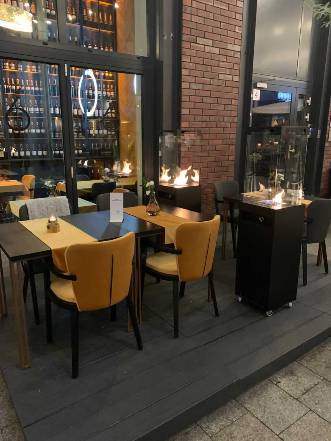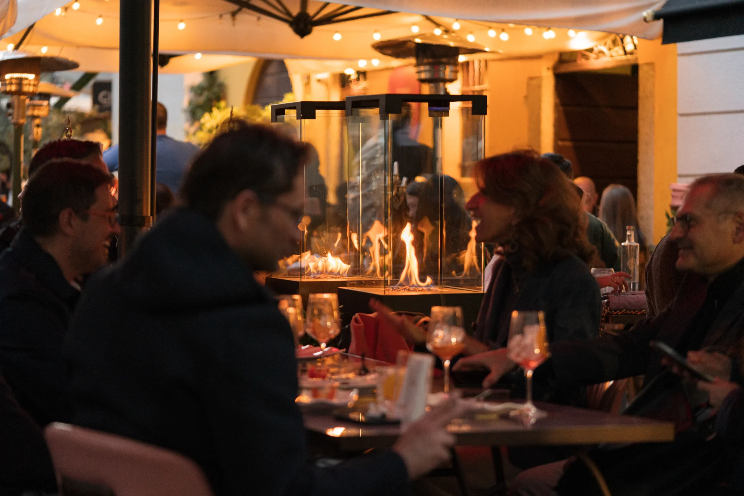 Den svarta designen gör den lätt att integrera i olika utemiljöer, från privata terrasser till kommersiella uteserveringar, och gör den till ett naturligt blickfång som både värmer och förhöjer stämningen.