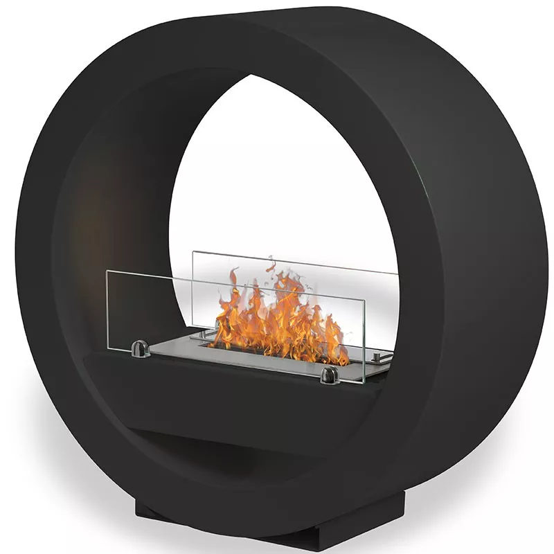 Izoa Svart är samma dekorativa bioetanolkamin i matt svart med rund form och elegant design. Den svarta ytan ger en sofistikerad kontrast till flammorna och gör modellen till ett fint designelement i vardagsrum, lounge eller andra sociala områden där du vill skapa mysig stämning och visuell värme.