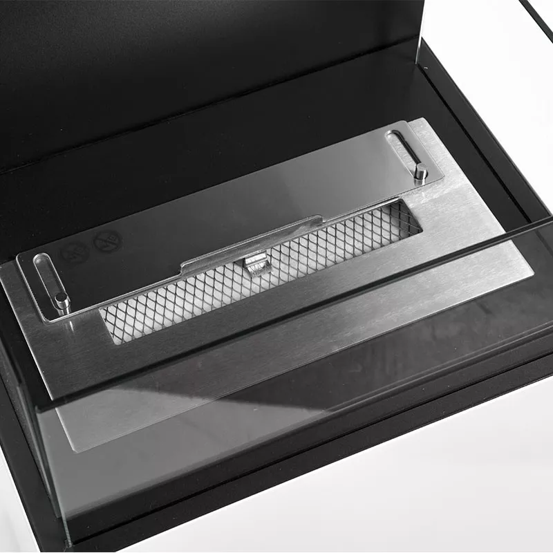 De tre härdade glaspanelerna runt lågorna ger både säkerhet och fri sikt över elden, vilket förstärker både designupplevelsen och tryggheten samtidigt som lågorna syns tydligt från flera vinklar.