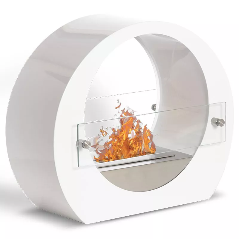Manhattan Vit är en elegant fristående golvkamin i bioetanol med rund form och blank vit finish som ger ett modernt och lätt uttryck i hemmet. Den runda designen med två skyddande glasrutor runt lågorna skapar ett dekorativt flamspel och gör modellen till ett vackert blickfång i vardagsrum, loungeytor eller öppna sociala miljöer – helt utan skorsten eller installation.