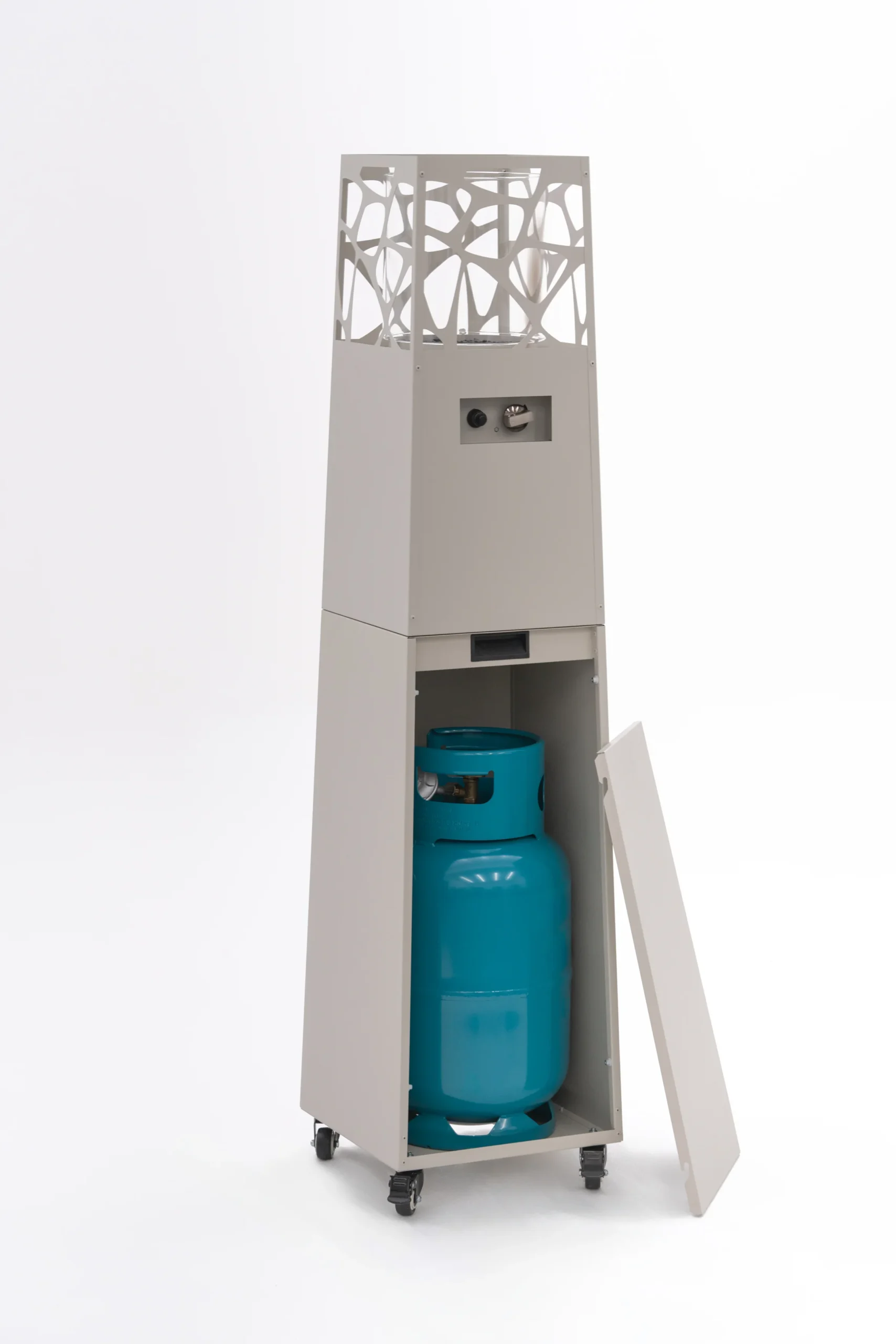 Pyramid Silk Grey drivs med LPG (Propan / gasol) och levererar en värmeeffekt på upp till 8,2 kW, vilket ger behaglig värme även under svalare kvällar. Gasolflaskan (upp till 11 kg) placeras diskret i basen, vilket ger ett rent uttryck samtidigt som du får upp till ca 55 timmars driftstid beroende på gasolanvändning och inställning.