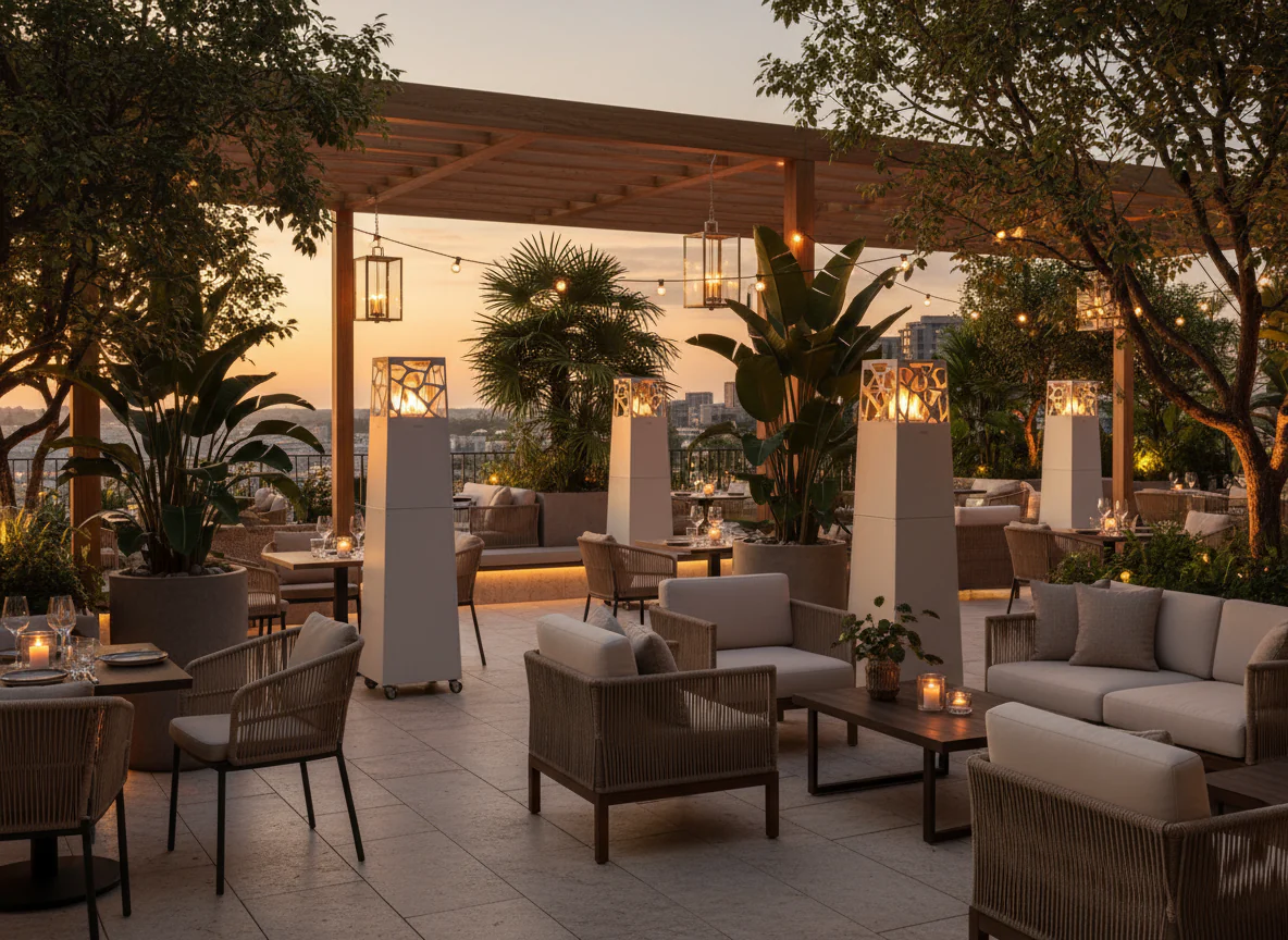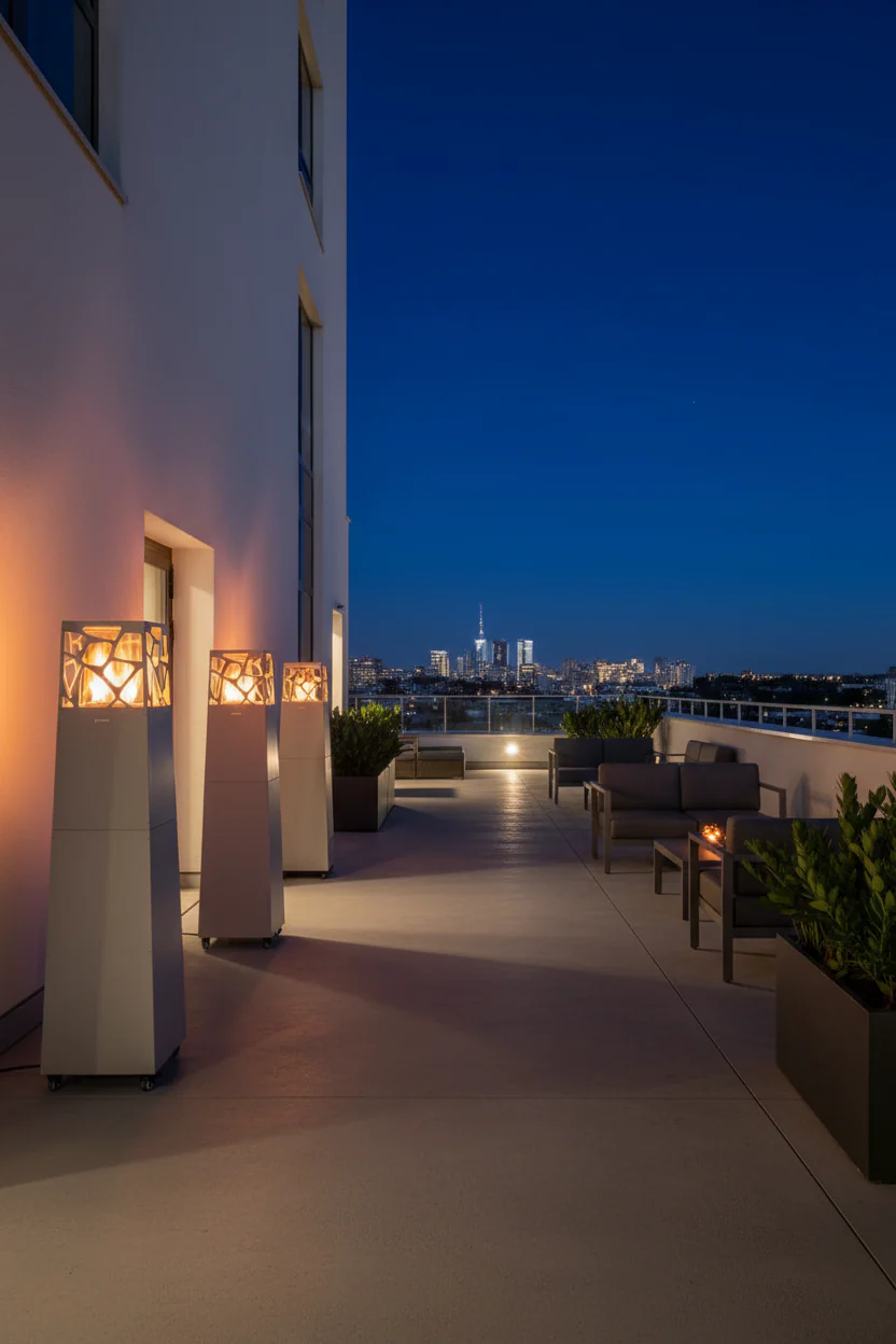 Den grå designen gör den lätt att integrera i olika miljöer, från privata trädgårdar till kommersiella uteplatser, och gör den till ett naturligt blickfång som både värmer och förhöjer stämningen.