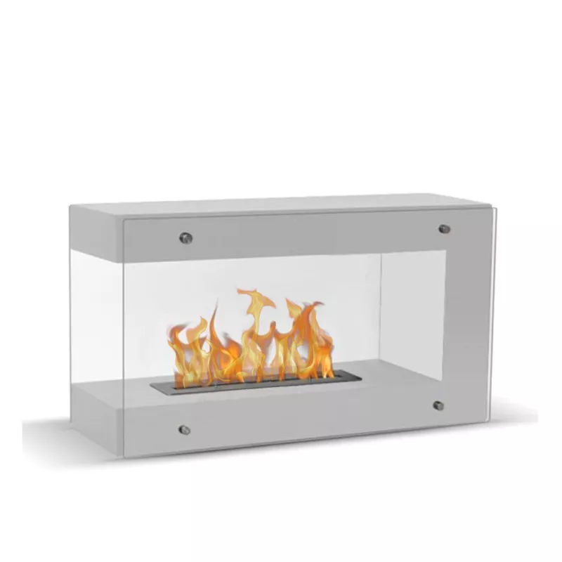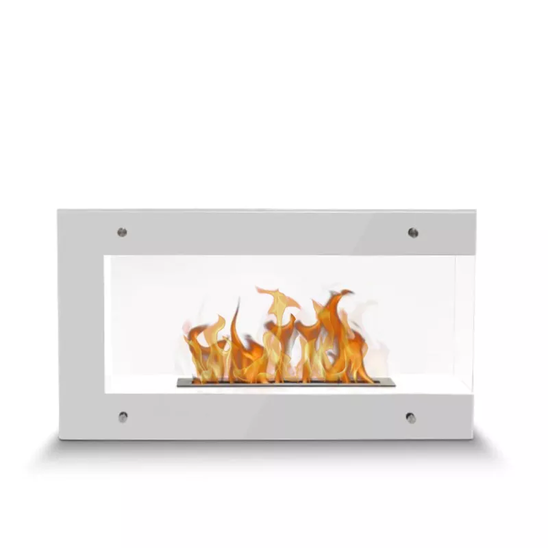 De två stora härdade glasrutorna runt flamområdet ger både säkerhet och fri sikt över lågorna, samtidigt som kromdetaljerna och den vita finishen ger en tidlös och stilren känsla som kompletterar flera inredningsstilar.